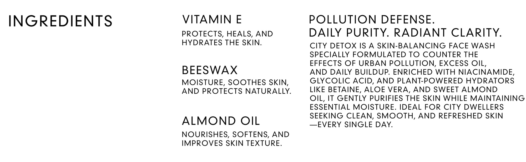 CITY DETOX is a skin-balancing face wash specially formulated to counter the effects of urban pollution, excess oil, and daily buildup. Enriched with niacinamide, glycolic acid, and plant-powered hydrators like betaine, aloe vera, and sweet almond oil, it gently purifies the skin while maintaining essential moisture. Ideal for city dwellers seeking clean, smooth, and refreshed skin—every single day.